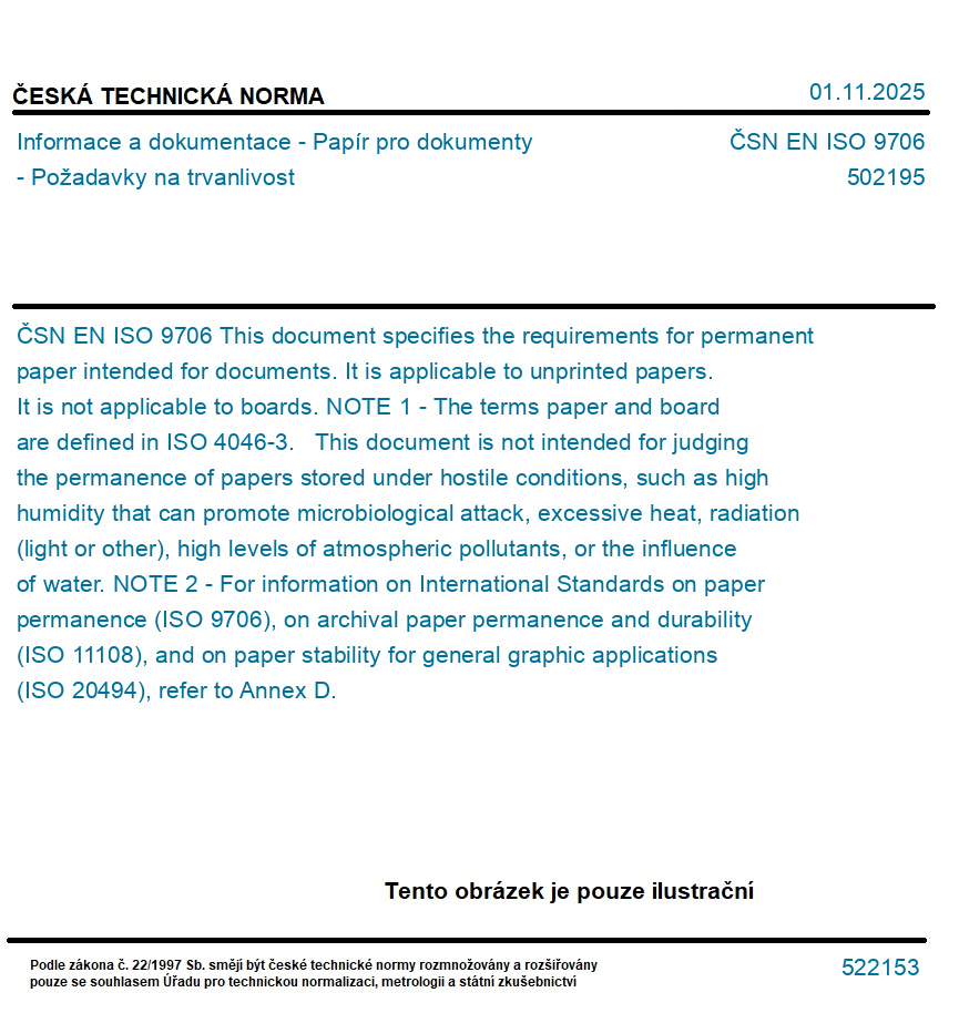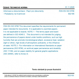 This document specifies the requirements for permanent paper intended for documents. It is applicable to unprinted papers. It is not applicable to boards. NOTE 1 - The terms paper and board are defined in ISO 4046-3. This document is not intended for judging the permanence of papers stored under hostile conditions, such as high humidity that can promote microbiological attack, excessive heat, radiation (light or other), high levels of atmospheric pollutants, or the influence of water. NOTE 2 - For information on International Standards on paper permanence (ISO 9706), on archival paper permanence and durability (ISO 11108), and on paper stability for general graphic applications (ISO 20494), refer to Annex D.