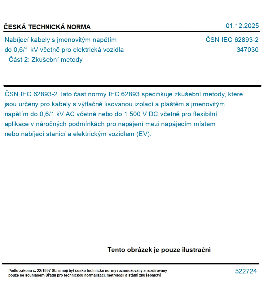 Nabíjecí kabely s jmenovitým napětím do 0,6/1 kV včetně pro elektrická vozidla - Část 2: Zkušební metody