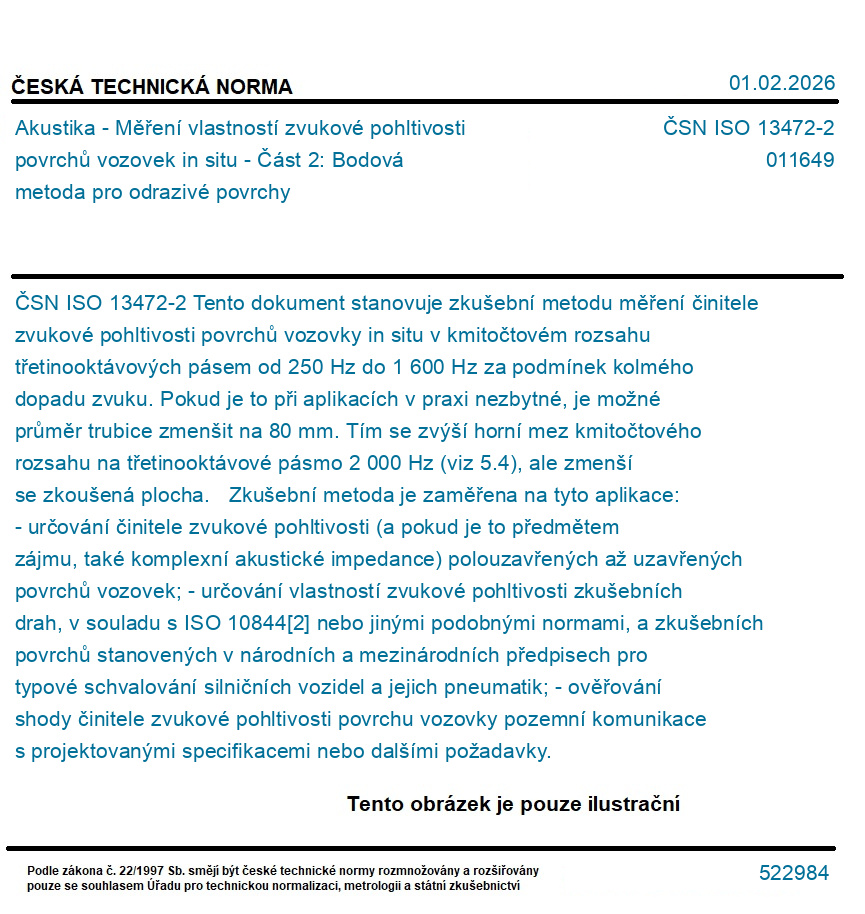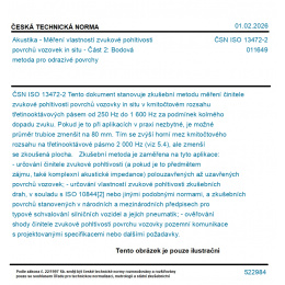 Tento dokument stanovuje zkušební metodu měření činitele zvukové pohltivosti povrchů vozovky in situ v kmitočtovém rozsahu třetinooktávových pásem od 250 Hz do 1 600 Hz za podmínek kolmého dopadu zvuku. Pokud je to při aplikacích v praxi nezbytné, je možné průměr trubice zmenšit na 80 mm. Tím se zvýší horní mez kmitočtového rozsahu na třetinooktávové pásmo 2 000 Hz (viz 5.4), ale zmenší se zkoušená plocha. Zkušební metoda je zaměřena na tyto aplikace: - určování činitele zvukové pohltivosti (a pokud je to předmětem zájmu, také komplexní akustické impedance) polouzavřených až uzavřených povrchů vozovek; - určování vlastností zvukové pohltivosti zkušebních drah, v souladu s ISO 10844[2] nebo jinými podobnými normami, a zkušebních povrchů stanovených v národních a mezinárodních předpisech pro typové schvalování silničních vozidel a jejich pneumatik; - ověřování shody činitele zvukové pohltivosti povrchu vozovky pozemní komunikace s projektovanými specifikacemi nebo dalšími požadavky.
