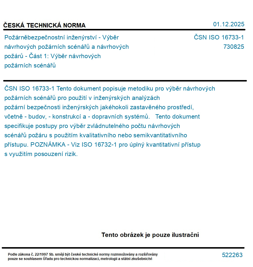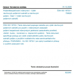 >ČSN ISO 16733-1 - Požárněbezpečnostní inženýrství - Výběr návrhových požárních scénářů a návrhových požárů - Část 1: Výběr návrhových požárních scénářů