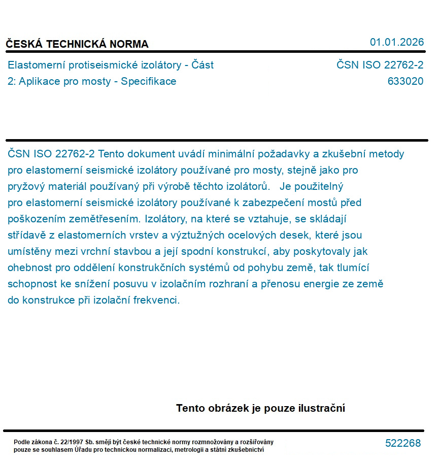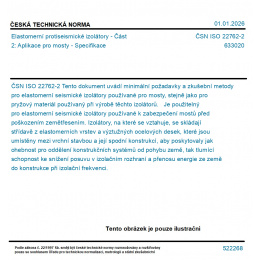 Tento dokument uvádí minimální požadavky a zkušební metody pro elastomerní seismické izolátory používané pro mosty, stejně jako pro pryžový materiál používaný při výrobě těchto izolátorů. Je použitelný pro elastomerní seismické izolátory používané k zabezpečení mostů před poškozením zemětřesením. Izolátory, na které se vztahuje, se skládají střídavě z elastomerních vrstev a výztužných ocelových desek, které jsou umístěny mezi vrchní stavbou a její spodní konstrukcí, aby poskytovaly jak ohebnost pro oddělení konstrukčních systémů od pohybu země, tak tlumící schopnost ke snížení posuvu v izolačním rozhraní a přenosu energie ze země do konstrukce při izolační frekvenci.