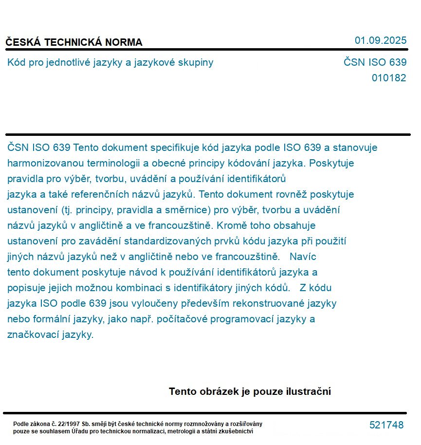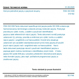 Tento dokument specifikuje kód jazyka podle ISO 639 a stanovuje harmonizovanou terminologii a obecné principy kódování jazyka. Poskytuje pravidla pro výběr, tvorbu, uvádění a používání identifikátorů jazyka a také referenčních názvů jazyků. Tento dokument rovněž poskytuje ustanovení (tj. principy, pravidla a směrnice) pro výběr, tvorbu a uvádění názvů jazyků v angličtině a ve francouzštině. Kromě toho obsahuje ustanovení pro zavádění standardizovaných prvků kódu jazyka při použití jiných názvů jazyků než v angličtině nebo ve francouzštině. Navíc tento dokument poskytuje návod k používání identifikátorů jazyka a popisuje jejich možnou kombinaci s identifikátory jiných kódů. Z kódu jazyka ISO podle 639 jsou vyloučeny především rekonstruované jazyky nebo formální jazyky, jako např. počítačové programovací jazyky a značkovací jazyky.
