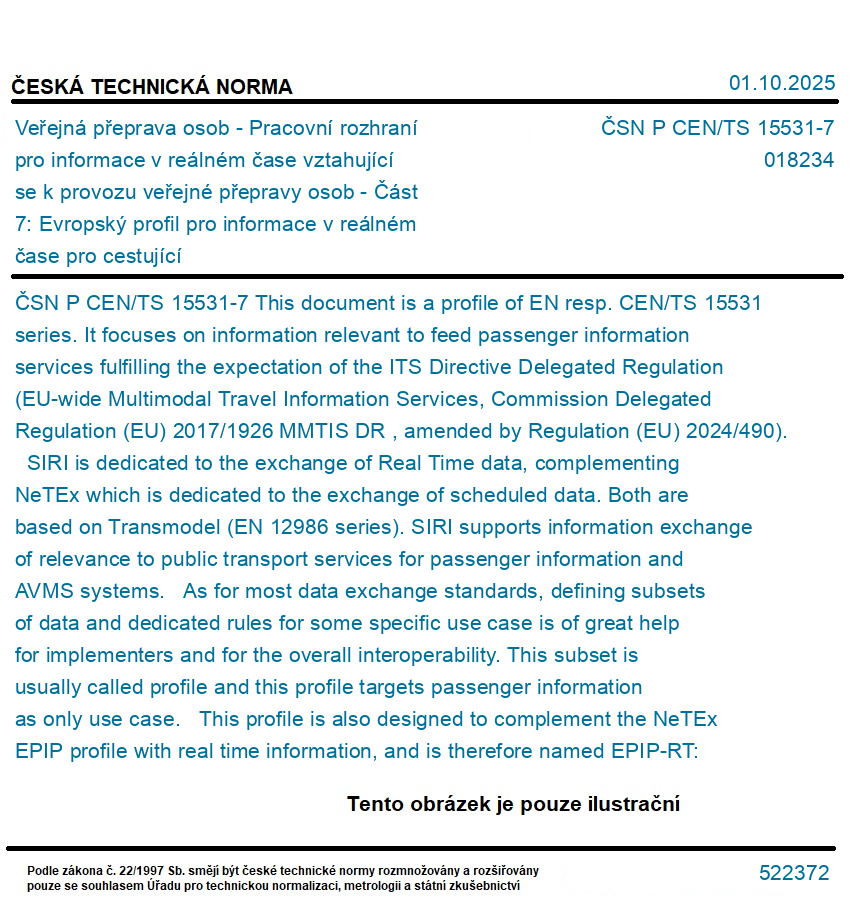 This document is a profile of EN resp. CEN/TS 15531 series. It focuses on information relevant to feed passenger information services fulfilling the expectation of the ITS Directive Delegated Regulation (EU-wide Multimodal Travel Information Services, Commission Delegated Regulation (EU) 2017/1926 MMTIS DR , amended by Regulation (EU) 2024/490). SIRI is dedicated to the exchange of Real Time data, complementing NeTEx which is dedicated to the exchange of scheduled data. Both are based on Transmodel (EN 12986 series). SIRI supports information exchange of relevance to public transport services for passenger information and AVMS systems. As for most data exchange standards, defining subsets of data and dedicated rules for some specific use case is of great help for implementers and for the overall interoperability. This subset is usually called profile and this profile targets passenger information as only use case. This profile is also designed to complement the NeTEx EPIP profile with real time information, and is therefore named EPIP-RT: both profiles are well articulated and can be uses seamlessly (at national level in NAPs -National Access Points- or at any local level where both scheduled and real time information are consistently provided).