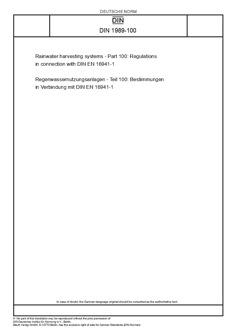 | Název produktu: | Rainwater harvesting systems - Part 100: Regulations in connection with DIN EN 16941-1 |