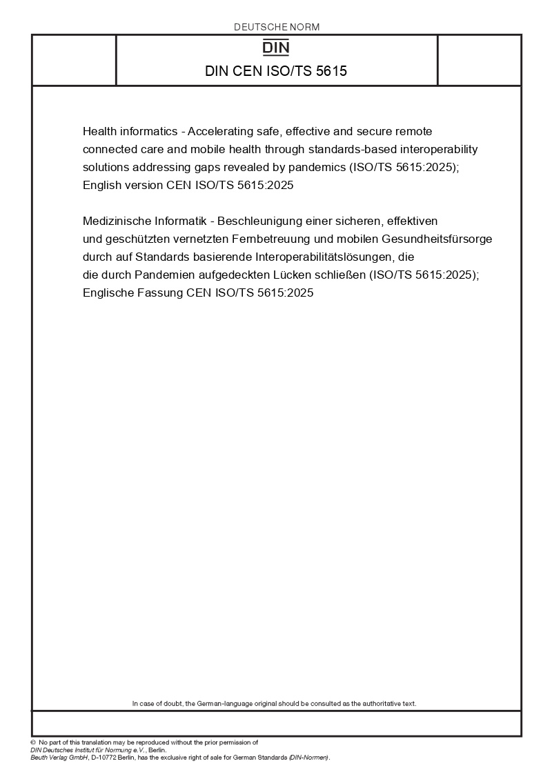 Medizinische Informatik - Beschleunigung einer sicheren, effektiven und geschützten vernetzten Fernbetreuung und mobilen Gesundheitsfürsorge durch auf Standards basierende Interoperabilitätslösungen, die die durch Pandemien aufgedeckten Lücken schließen (ISO/TS 5615:2025); Englische Fassung CEN ISO/TS 5615:2025