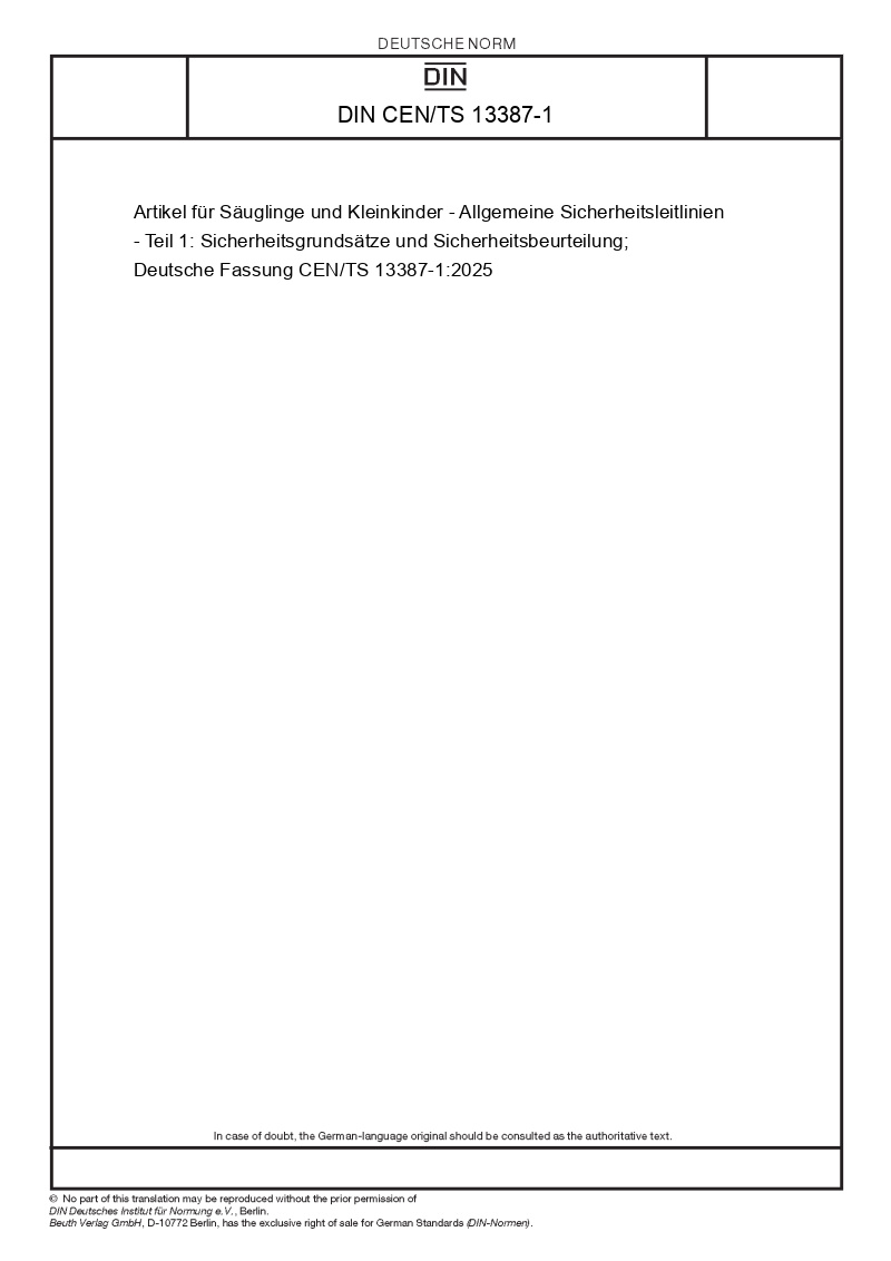 | Název produktu: | Artikel für Säuglinge und Kleinkinder - Allgemeine Sicherheitsleitlinien - Teil 1: Sicherheitsgrundsätze und Sicherheitsbeurteilung; Deutsche Fassung CEN/TS 13387-1:2025 |