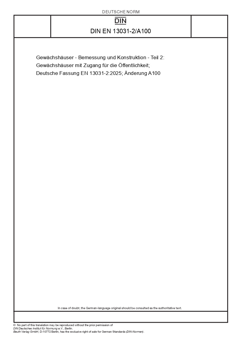 >DIN EN 13031-2/A100 Gewächshäuser - Bemessung und Konstruktion - Teil 2: Gewächshäuser mit Zugang für die Öffentlichkeit; Deutsche Fassung EN 13031-2:2025; Änderung A100