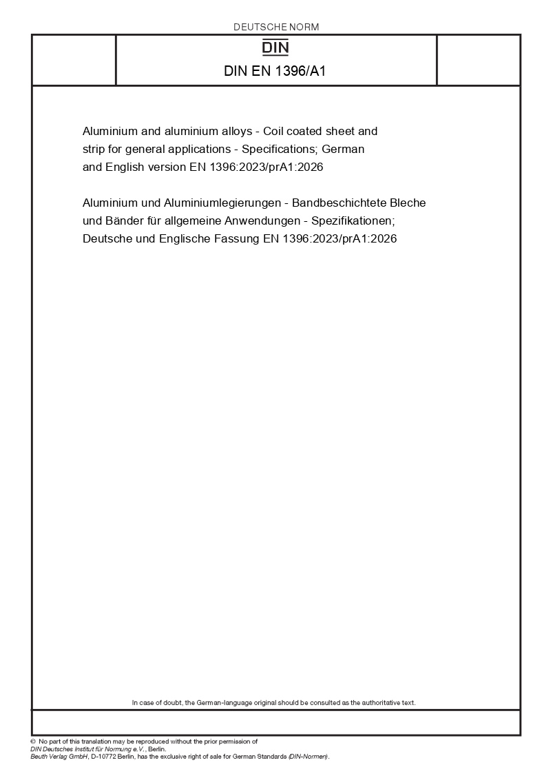 Aluminium and aluminium alloys - Coil coated sheet and strip for general applications - Specifications; German and English version EN 1396:2023/prA1:2026