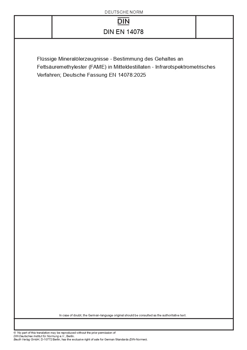 Flüssige Mineralölerzeugnisse - Bestimmung des Gehaltes an Fettsäuremethylester (FAME) in Mitteldestillaten - Infrarotspektrometrisches Verfahren; Deutsche Fassung EN 14078:2025