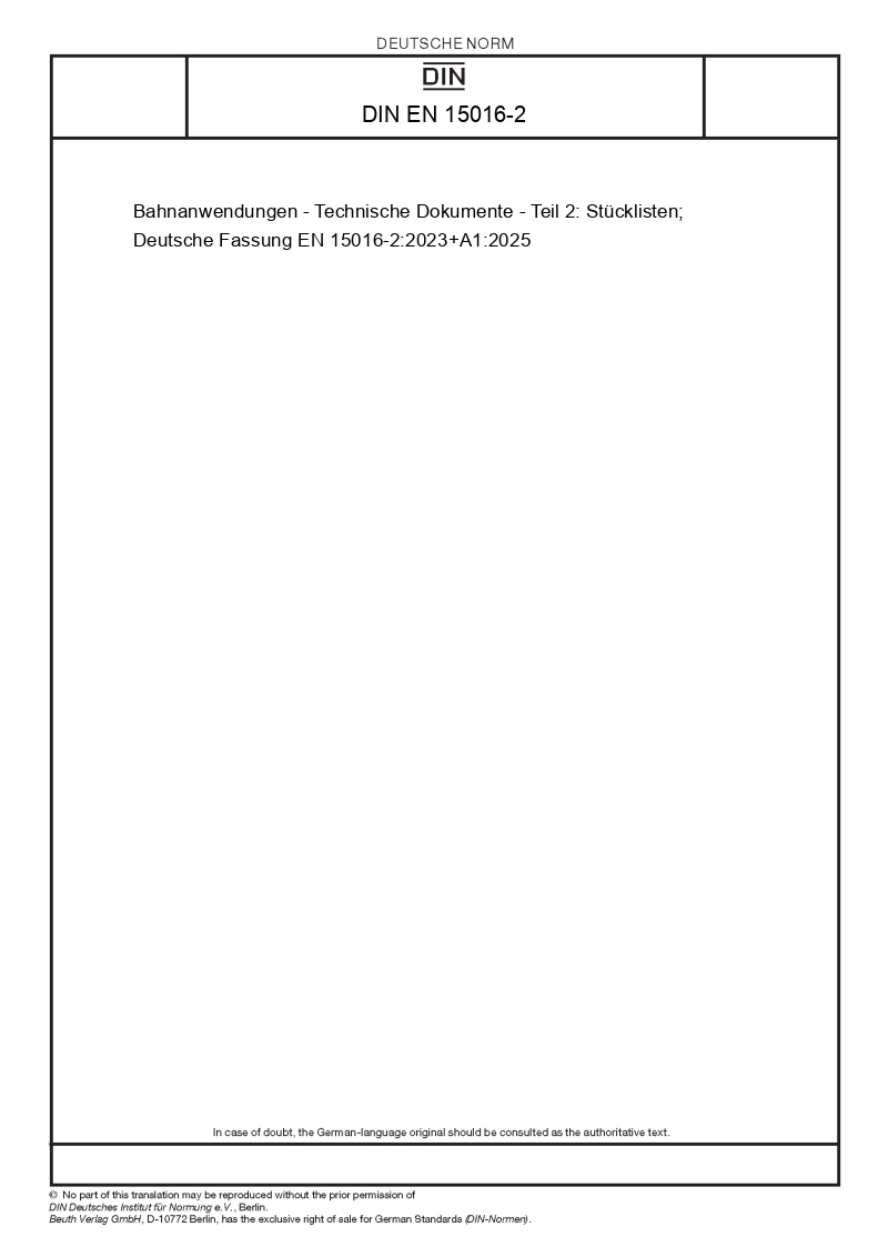 | Název produktu: | Bahnanwendungen - Technische Dokumente - Teil 2: Stücklisten; Deutsche Fassung EN 15016-2:2023+A1:2025 |