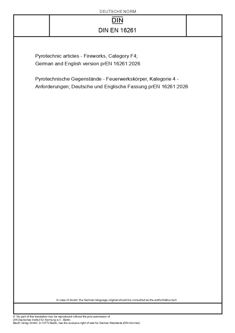| Název produktu: | Pyrotechnic articles - Fireworks, Category F4; German and English version prEN 16261:2026 |