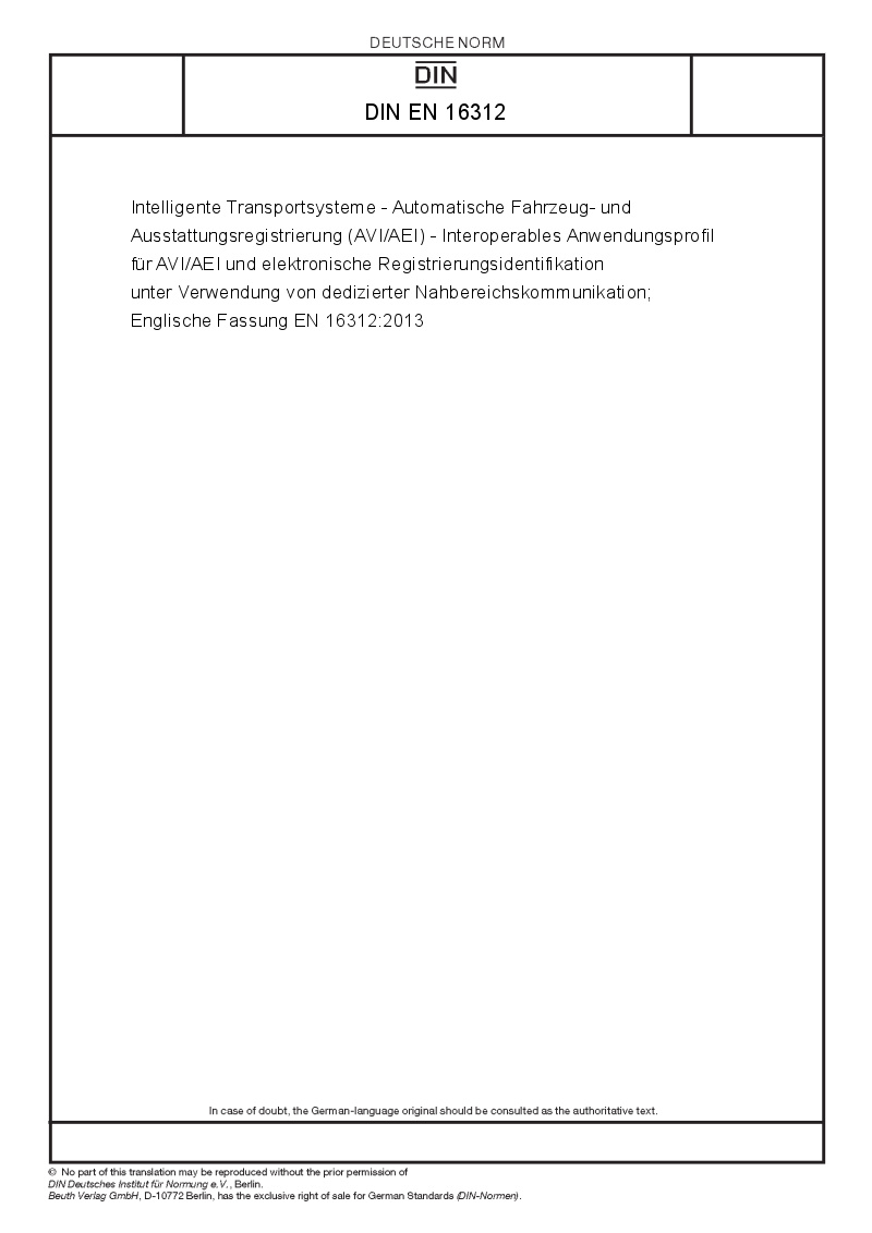 Intelligente Transportsysteme - Automatische Fahrzeug- und Ausstattungsregistrierung (AVI/AEI) - Interoperables Anwendungsprofil für AVI/AEI und elektronische Registrierungsidentifikation unter Verwendung von dedizierter Nahbereichskommunikation; Englische Fassung EN 16312:2013