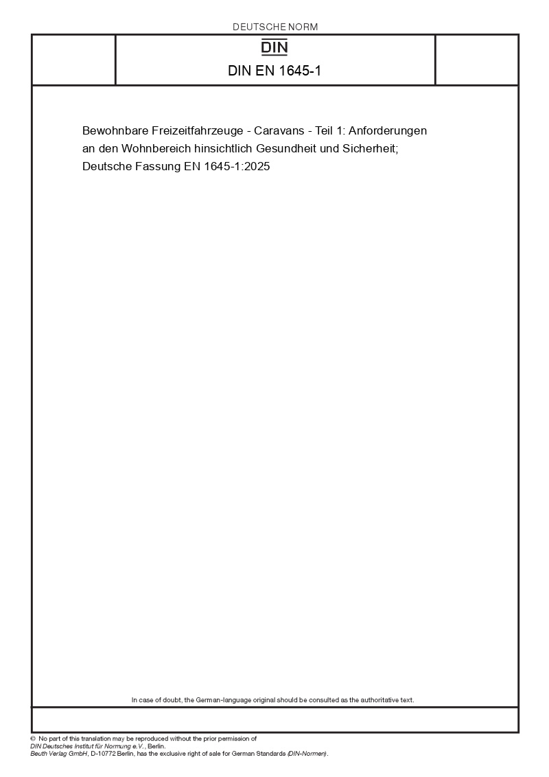 Bewohnbare Freizeitfahrzeuge - Caravans - Teil 1: Anforderungen an den Wohnbereich hinsichtlich Gesundheit und Sicherheit; Deutsche Fassung EN 1645-1:2025