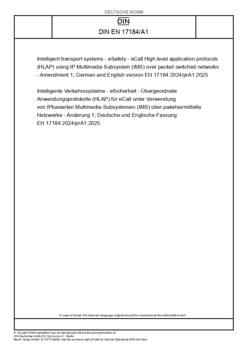 Intelligente Verkehrssysteme - eSicherheit - Übergeordnete Anwendungsprotokolle (HLAP) für eCall unter Verwendung von IPbasierten Multimedia-Subsystemen (IMS) über paketvermittelte Netzwerke - Änderung 1; Deutsche und Englische Fassung EN 17184:2024/prA1:2025