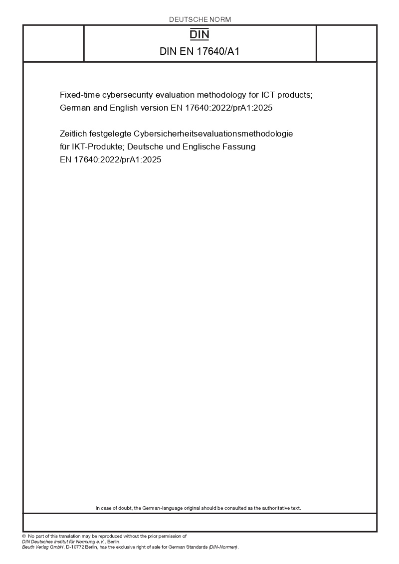 Fixed-time cybersecurity evaluation methodology for ICT products; German and English version EN 17640:2022/prA1:2025