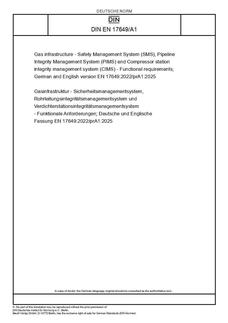 Gas infrastructure - Safety Management System (SMS), Pipeline Integrity Management System (PIMS) and Compressor station integrity management system (CIMS) - Functional requirements; German and English version EN 17649:2022/prA1:2025