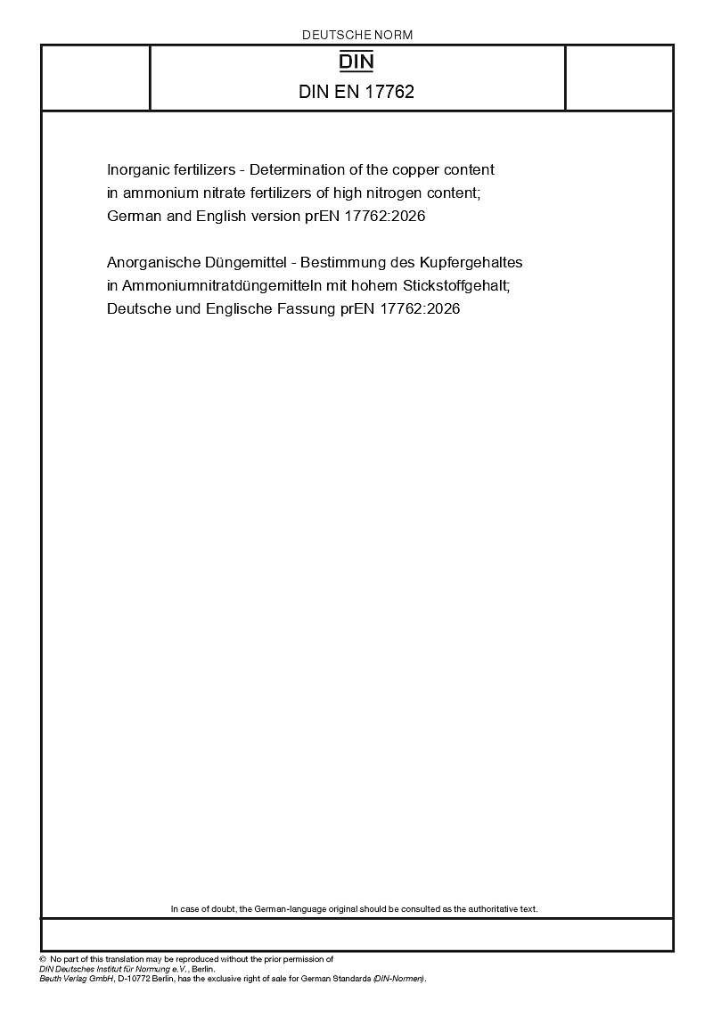Inorganic fertilizers - Determination of the copper content in ammonium nitrate fertilizers of high nitrogen content; German and English version prEN 17762:2026