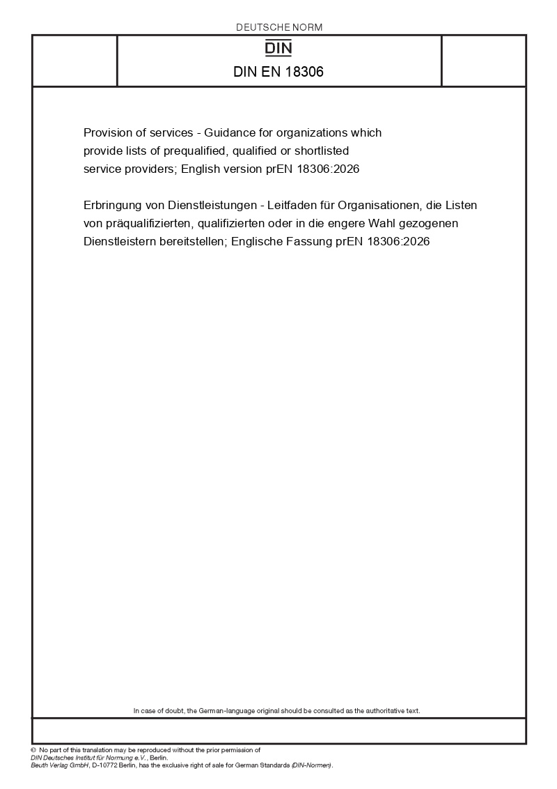 Erbringung von Dienstleistungen - Leitfaden für Organisationen, die Listen von präqualifizierten, qualifizierten oder in die engere Wahl gezogenen Dienstleistern bereitstellen; Englische Fassung prEN 18306:2026