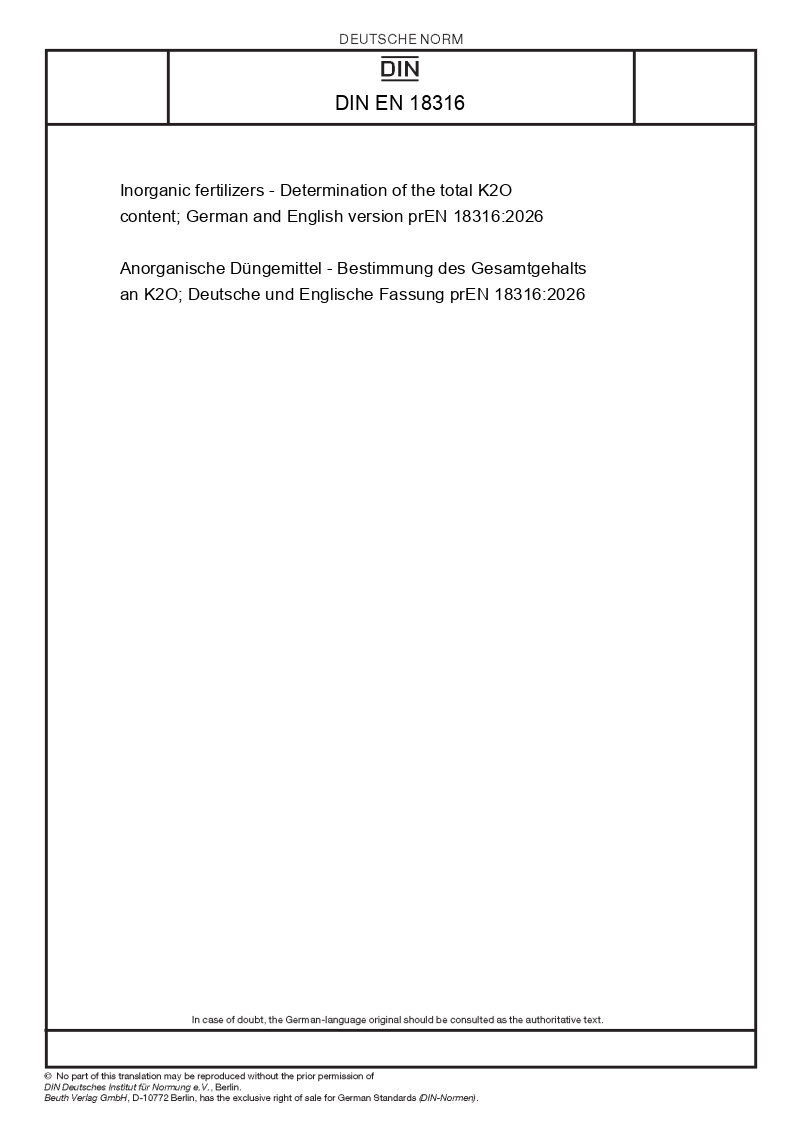 Anorganische Düngemittel - Bestimmung des Gesamtgehalts an K2O; Deutsche und Englische Fassung prEN 18316:2026