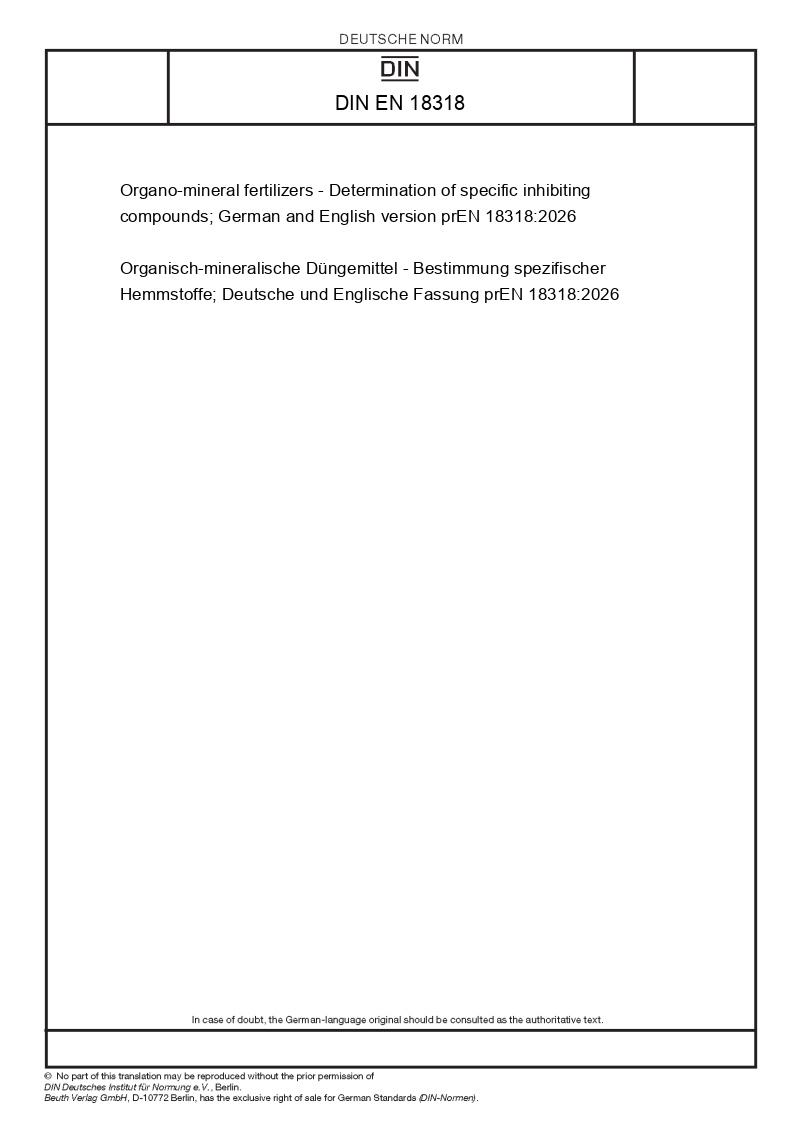 | Název produktu: | Organo-mineral fertilizers - Determination of specific inhibiting compounds; German and English version prEN 18318:2026 |
