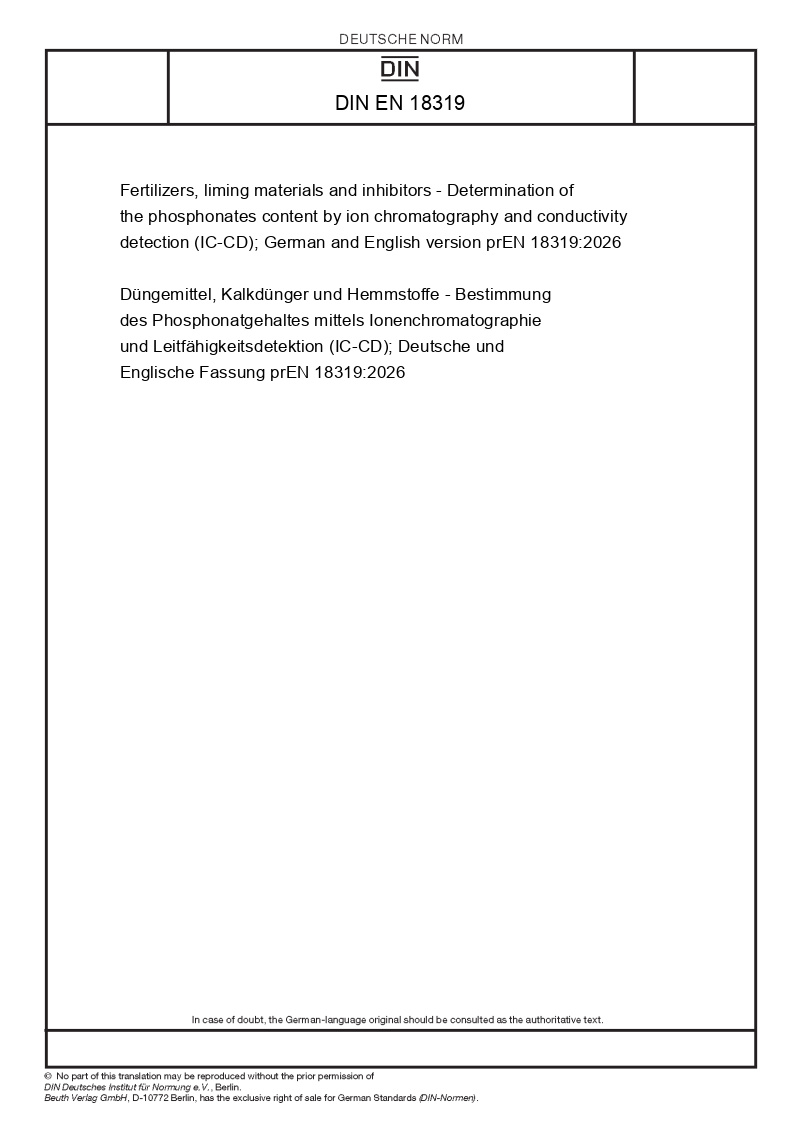 | Název produktu: | Fertilizers, liming materials and inhibitors - Determination of the phosphonates content by ion chromatography and conductivity detection (IC-CD); German and English version prEN 18319:2026 |