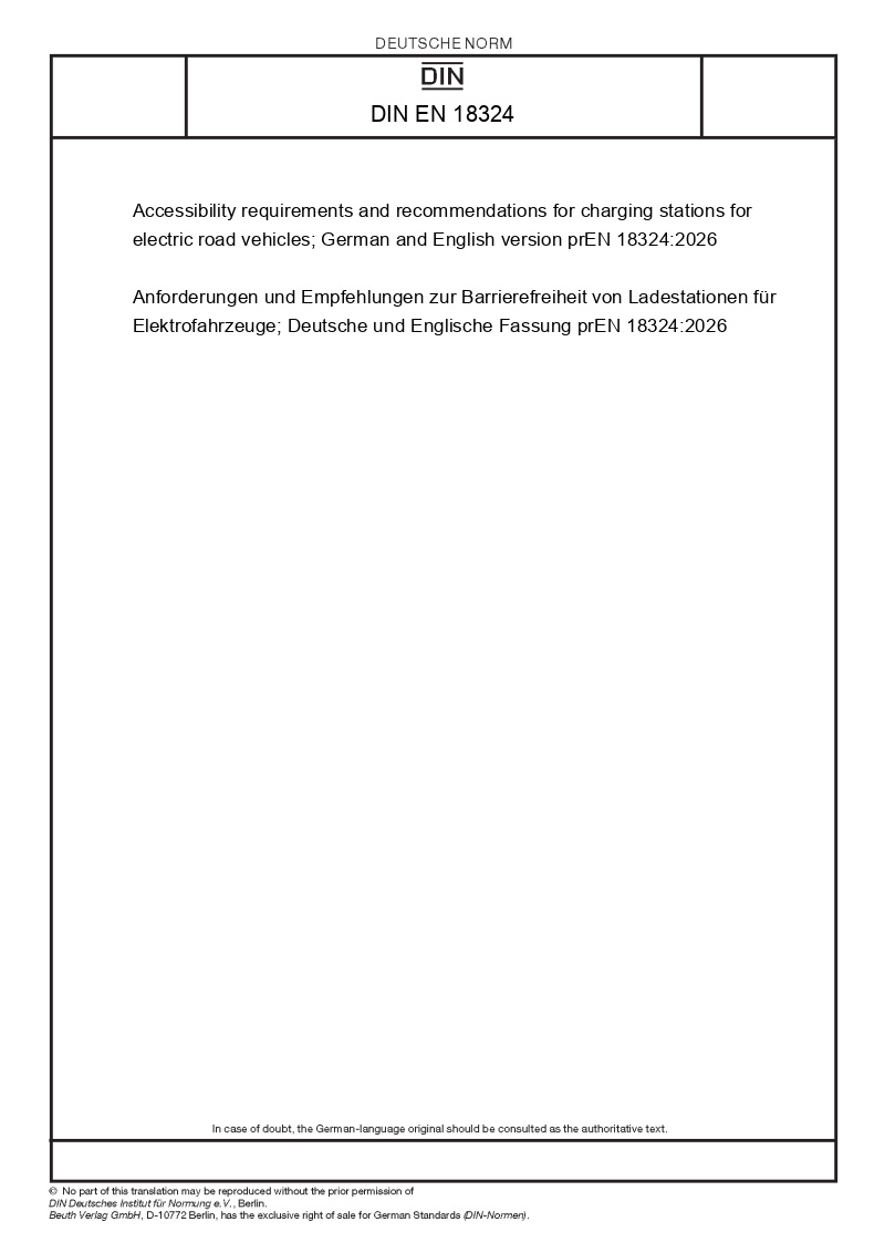 | Název produktu: | Accessibility requirements and recommendations for charging stations for electric road vehicles; German and English version prEN 18324:2026 |
