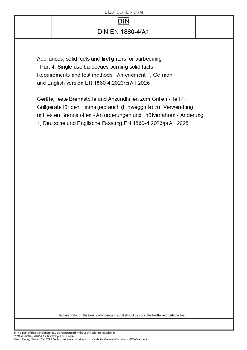 Appliances, solid fuels and firelighters for barbecuing - Part 4: Single use barbecues burning solid fuels - Requirements and test methods - Amendment 1; German and English version EN 1860-4:2023/prA1:2026