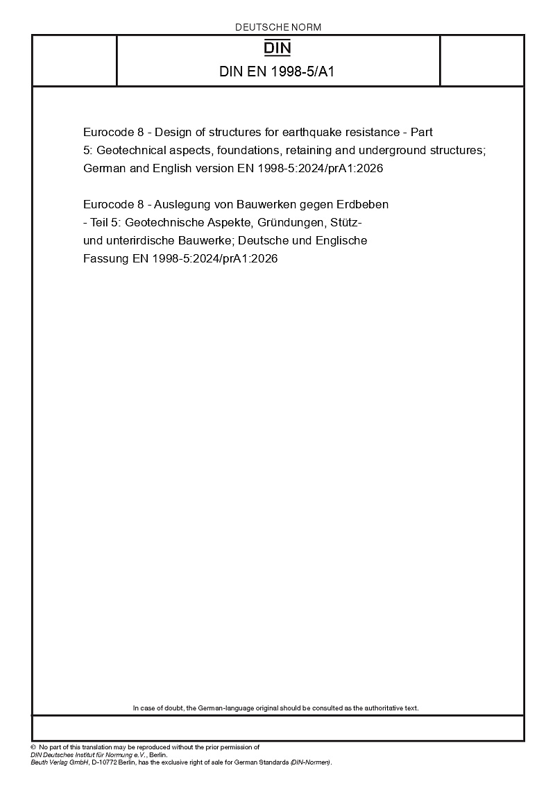 Eurocode 8 - Auslegung von Bauwerken gegen Erdbeben - Teil 5: Geotechnische Aspekte, Gründungen, Stütz- und unterirdische Bauwerke; Deutsche und Englische Fassung EN 1998-5:2024/prA1:2026