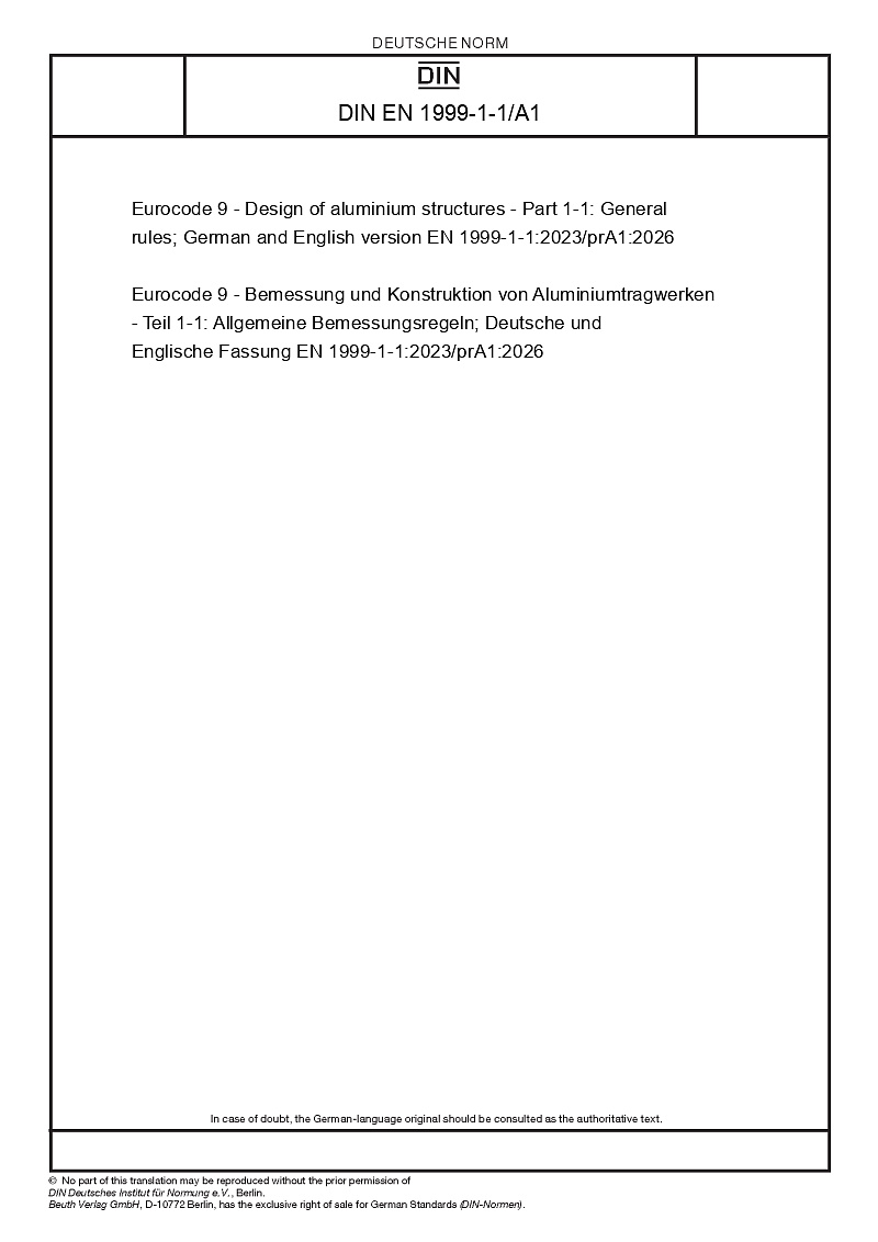 | Název produktu: | Eurocode 9 - Design of aluminium structures - Part 1-1: General rules; German and English version EN 1999-1-1:2023/prA1:2026 |