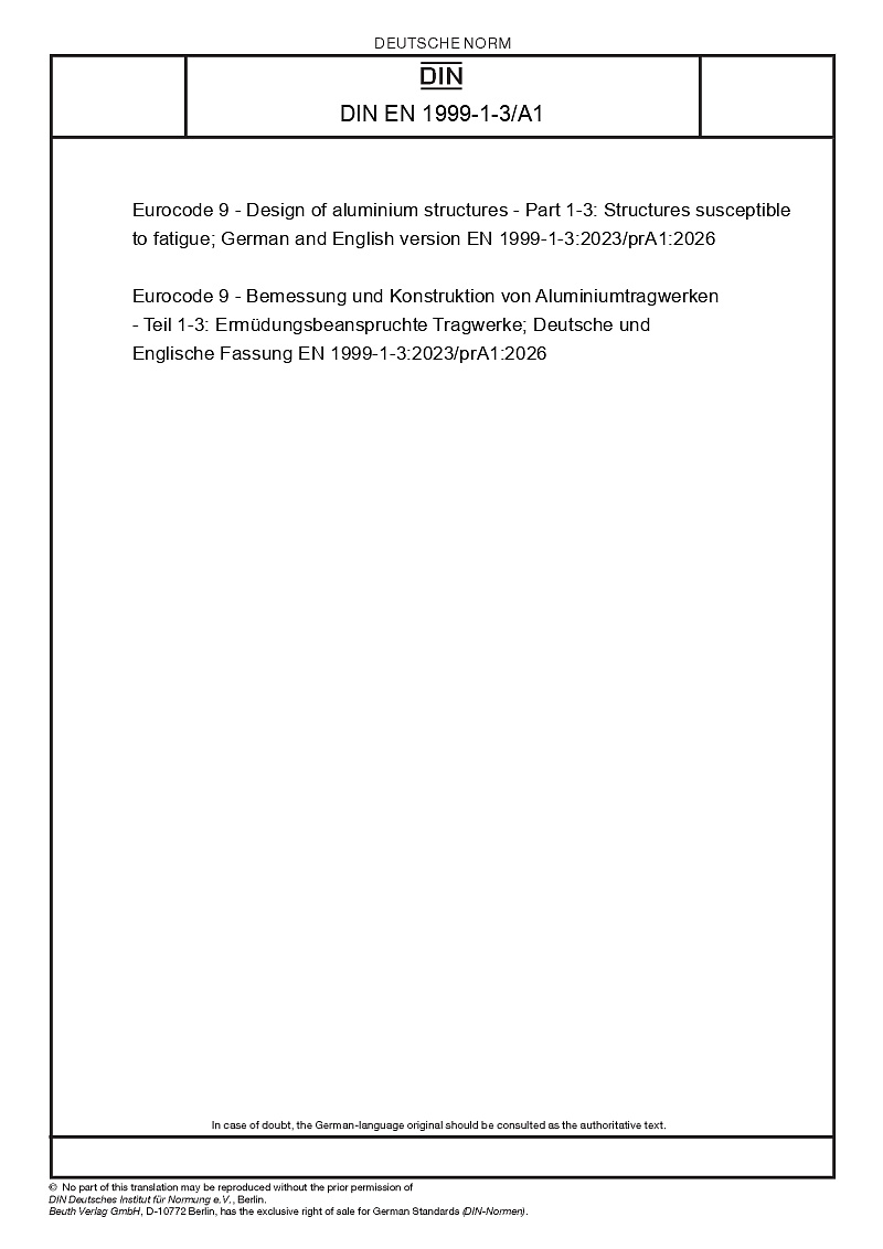 Eurocode 9 - Bemessung und Konstruktion von Aluminiumtragwerken - Teil 1-3: Ermüdungsbeanspruchte Tragwerke; Deutsche und Englische Fassung EN 1999-1-3:2023/prA1:2026