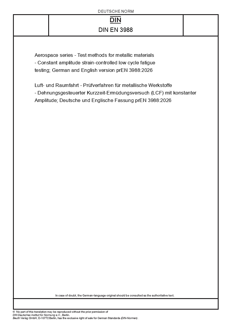 Luft- und Raumfahrt - Prüfverfahren für metallische Werkstoffe - Dehnungsgesteuerter Kurzzeit-Ermüdungsversuch (LCF) mit konstanter Amplitude; Deutsche und Englische Fassung prEN 3988:2026