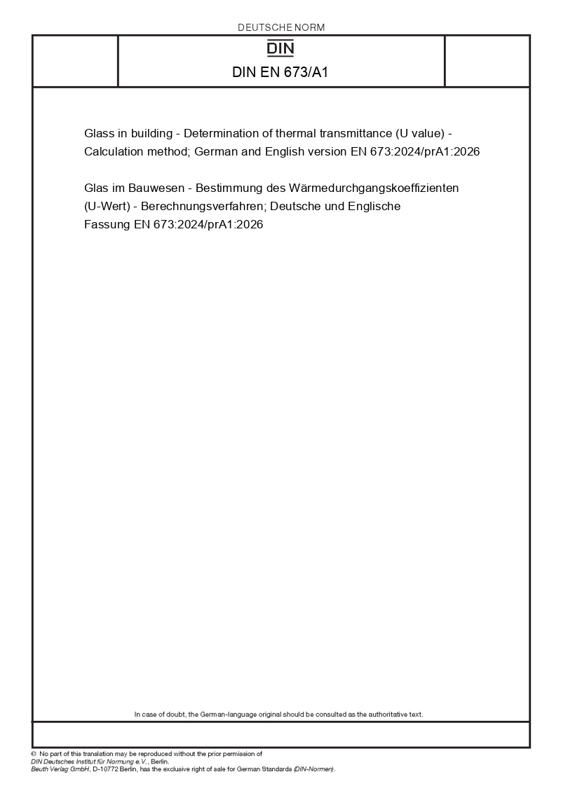 Glass in building - Determination of thermal transmittance (U value) - Calculation method; German and English version EN 673:2024/prA1:2026