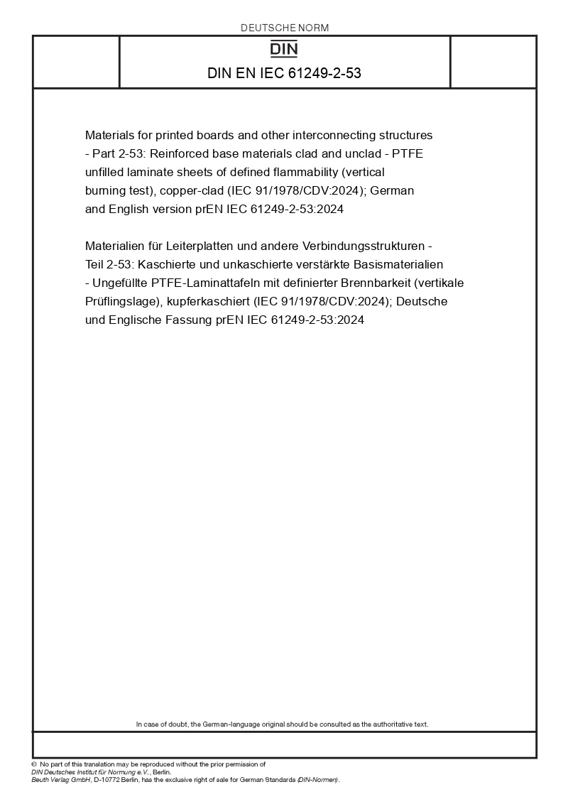 Materials for printed boards and other interconnecting structures - Part 2-53: Reinforced base materials clad and unclad - PTFE unfilled laminate sheets of defined flammability (vertical burning test), copper-clad (IEC 91/1978/CDV:2024); German and English version prEN IEC 61249-2-53:2024