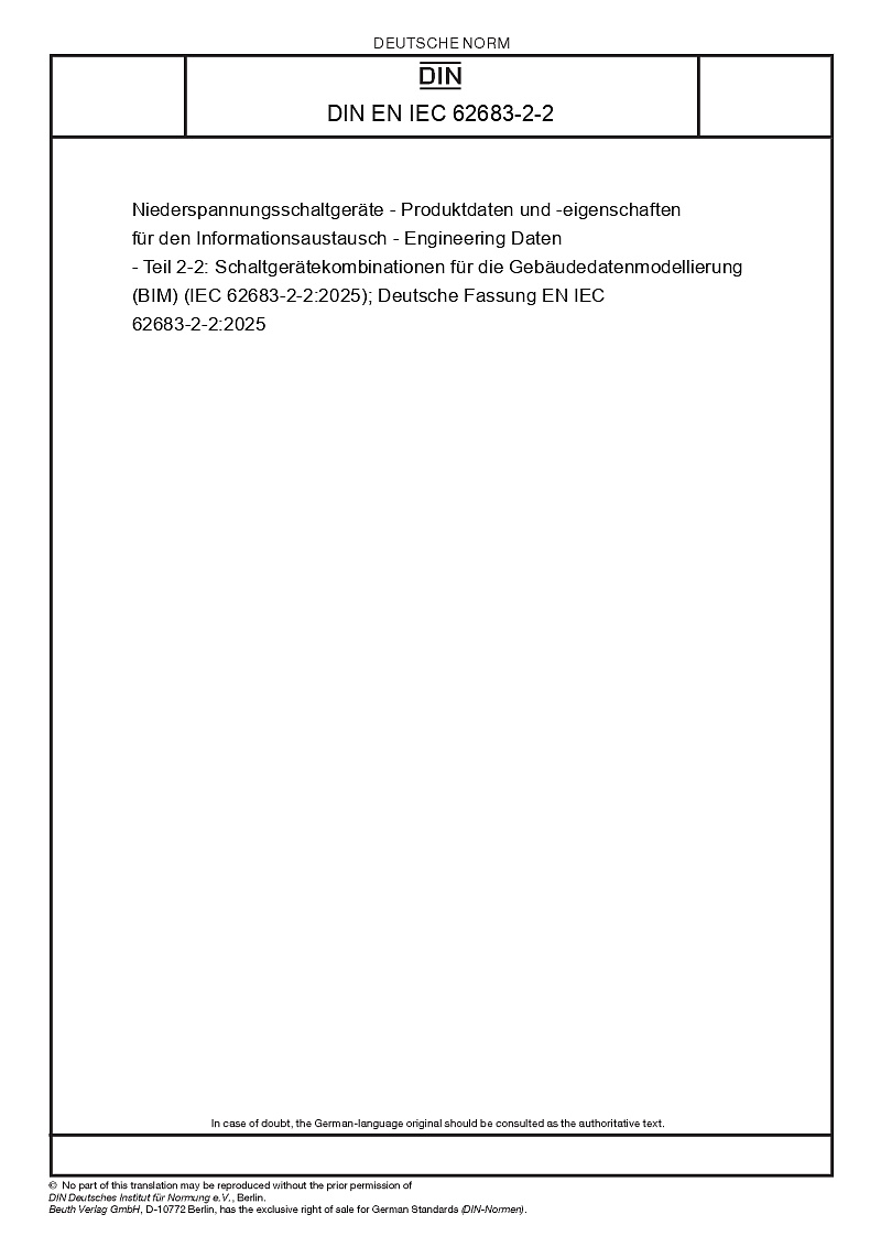 Niederspannungsschaltgeräte - Produktdaten und -eigenschaften für den Informationsaustausch - Engineering Daten - Teil 2-2: Schaltgerätekombinationen für die Gebäudedatenmodellierung (BIM) (IEC 62683-2-2:2025); Deutsche Fassung EN IEC 62683-2-2:2025