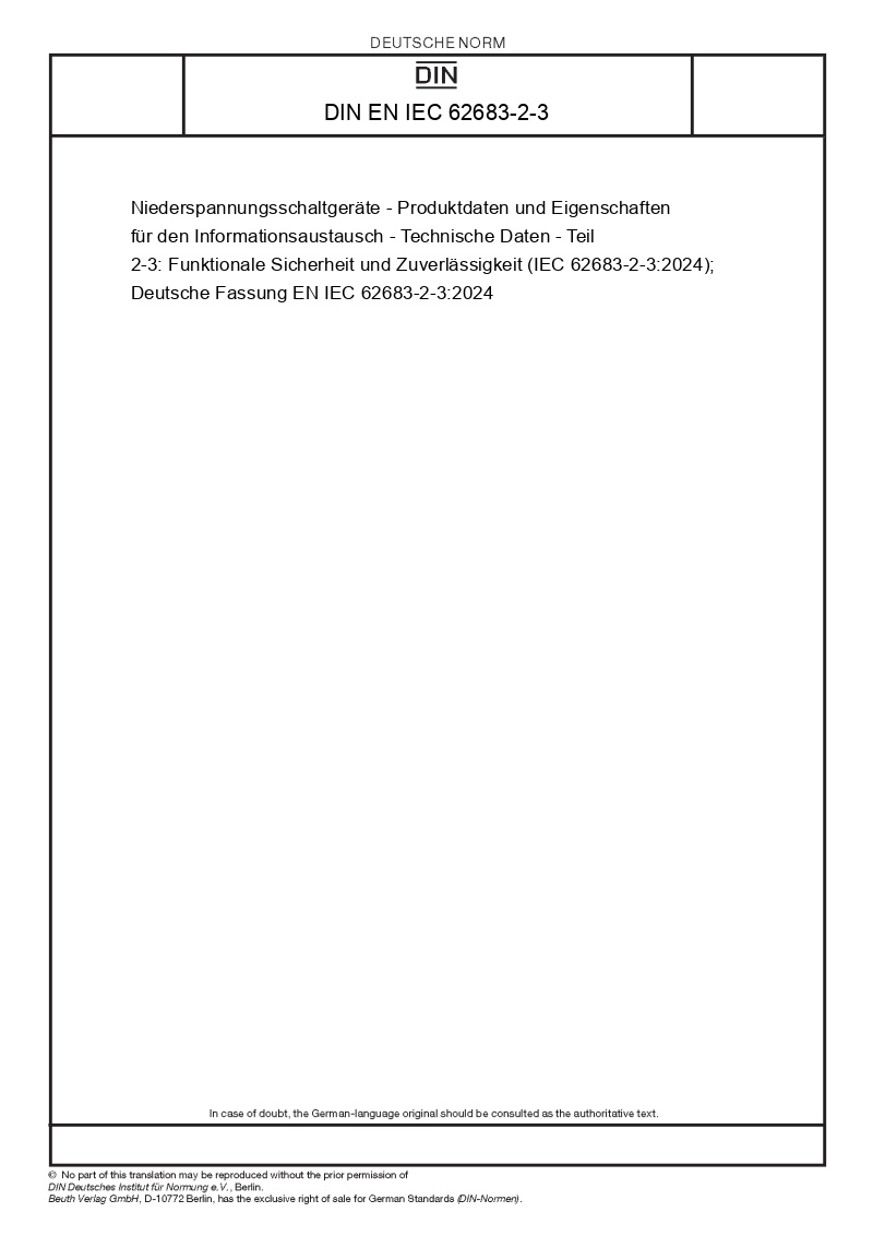 Niederspannungsschaltgeräte - Produktdaten und Eigenschaften für den Informationsaustausch - Technische Daten - Teil 2-3: Funktionale Sicherheit und Zuverlässigkeit (IEC 62683-2-3:2024); Deutsche Fassung EN IEC 62683-2-3:2024