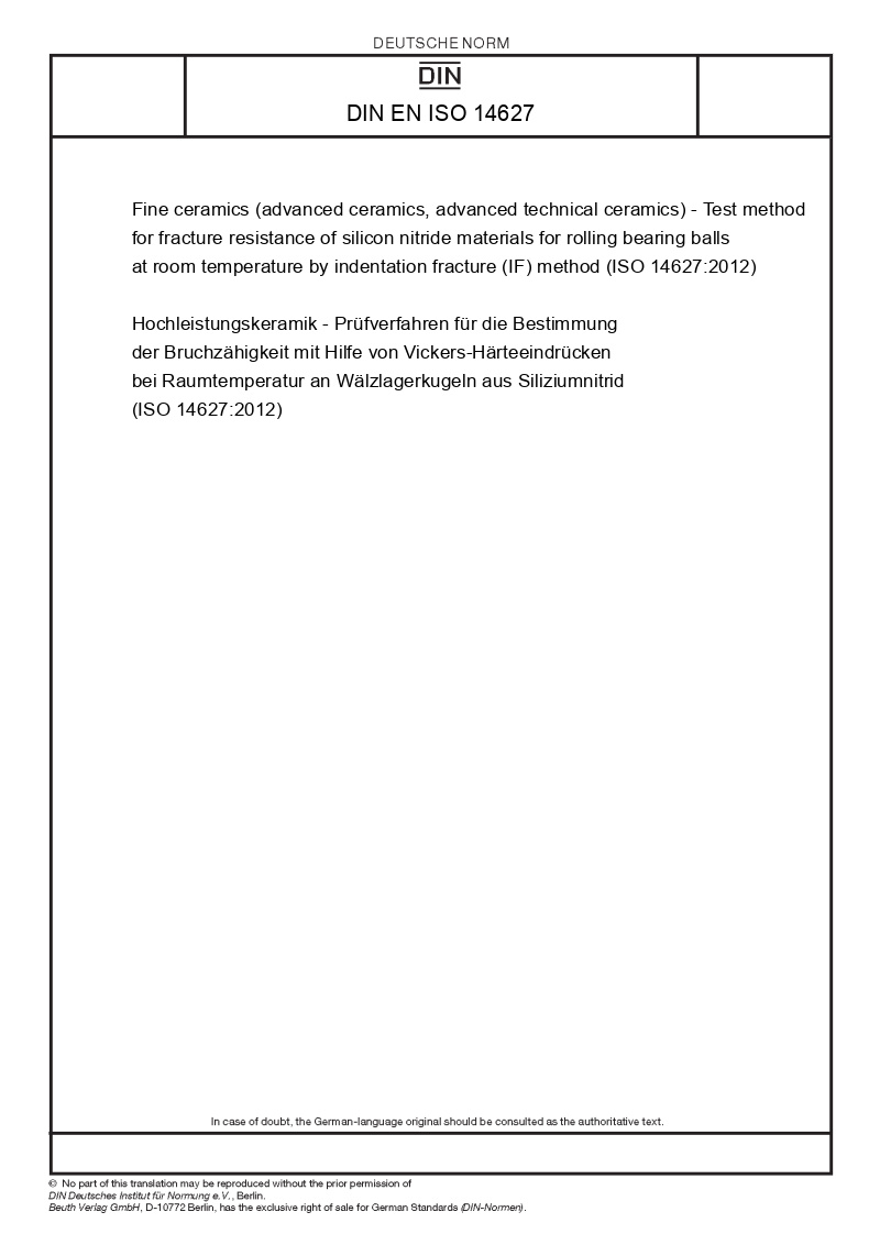 Hochleistungskeramik - Prüfverfahren für die Bestimmung der Bruchzähigkeit mit Hilfe von Vickers-Härteeindrücken bei Raumtemperatur an Wälzlagerkugeln aus Siliziumnitrid (ISO 14627:2012)