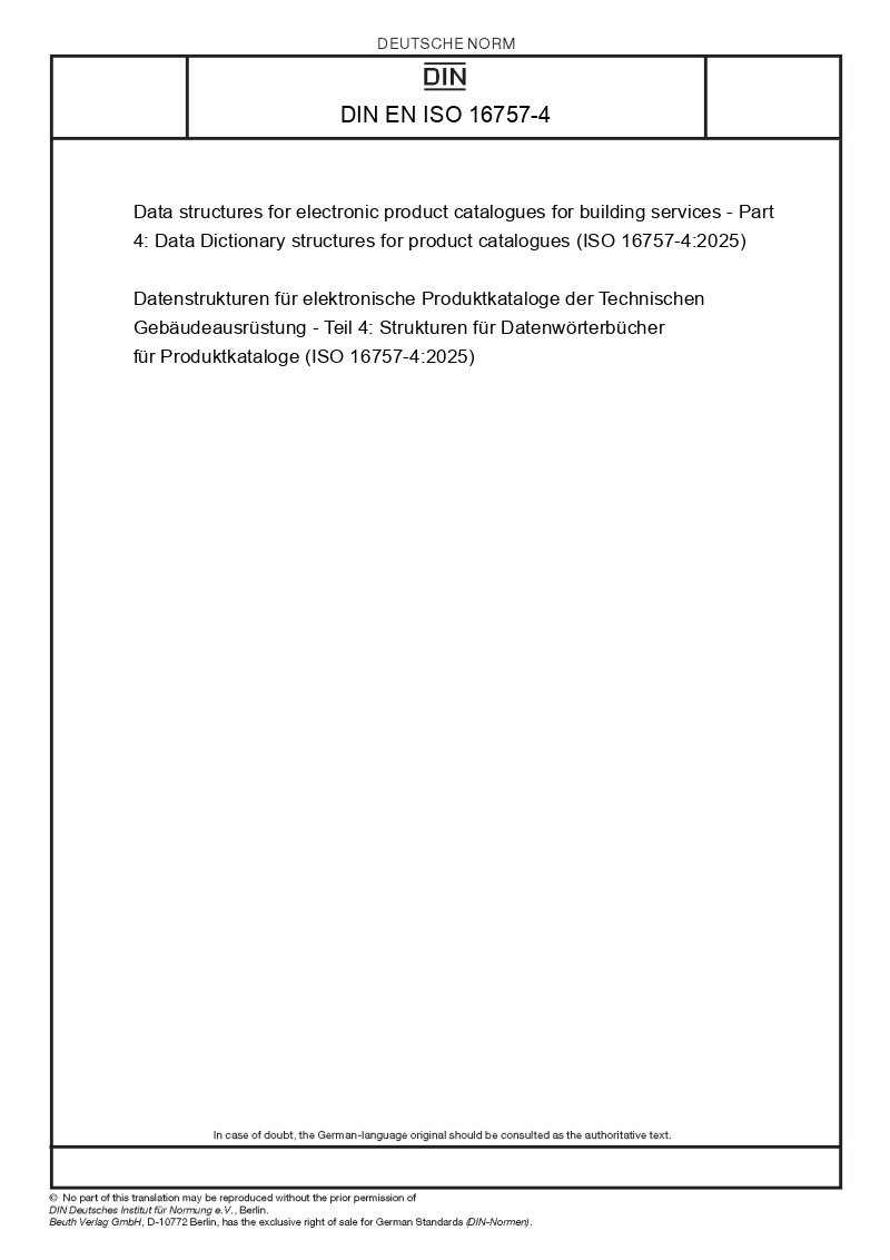 Datenstrukturen für elektronische Produktkataloge der Technischen Gebäudeausrüstung - Teil 4: Strukturen für Datenwörterbücher für Produktkataloge (ISO 16757-4:2025)