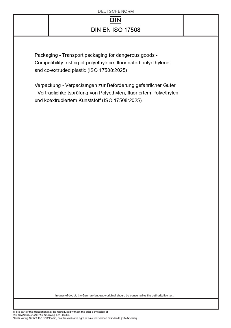 Verpackung - Verpackungen zur Beförderung gefährlicher Güter - Verträglichkeitsprüfung von Polyethylen, fluoriertem Polyethylen und koextrudiertem Kunststoff (ISO 17508:2025)