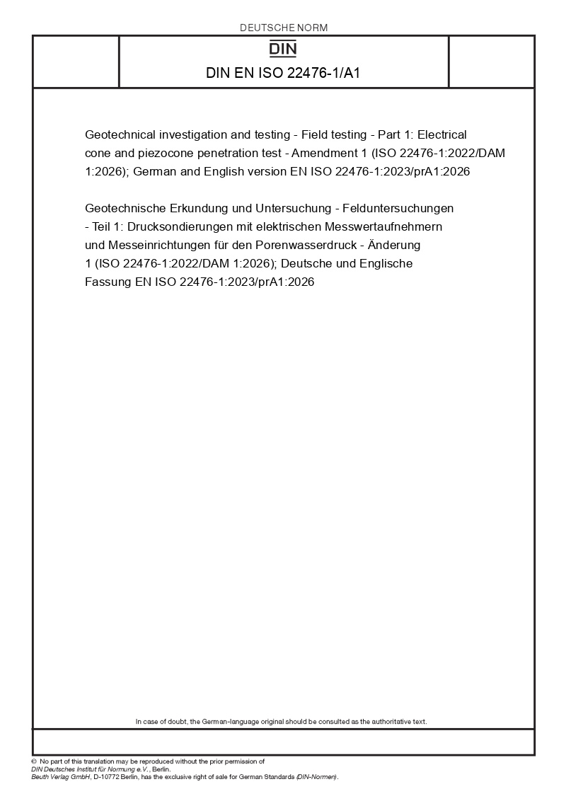 Geotechnical investigation and testing - Field testing - Part 1: Electrical cone and piezocone penetration test - Amendment 1 (ISO 22476-1:2022/DAM 1:2026); German and English version EN ISO 22476-1:2023/prA1:2026
