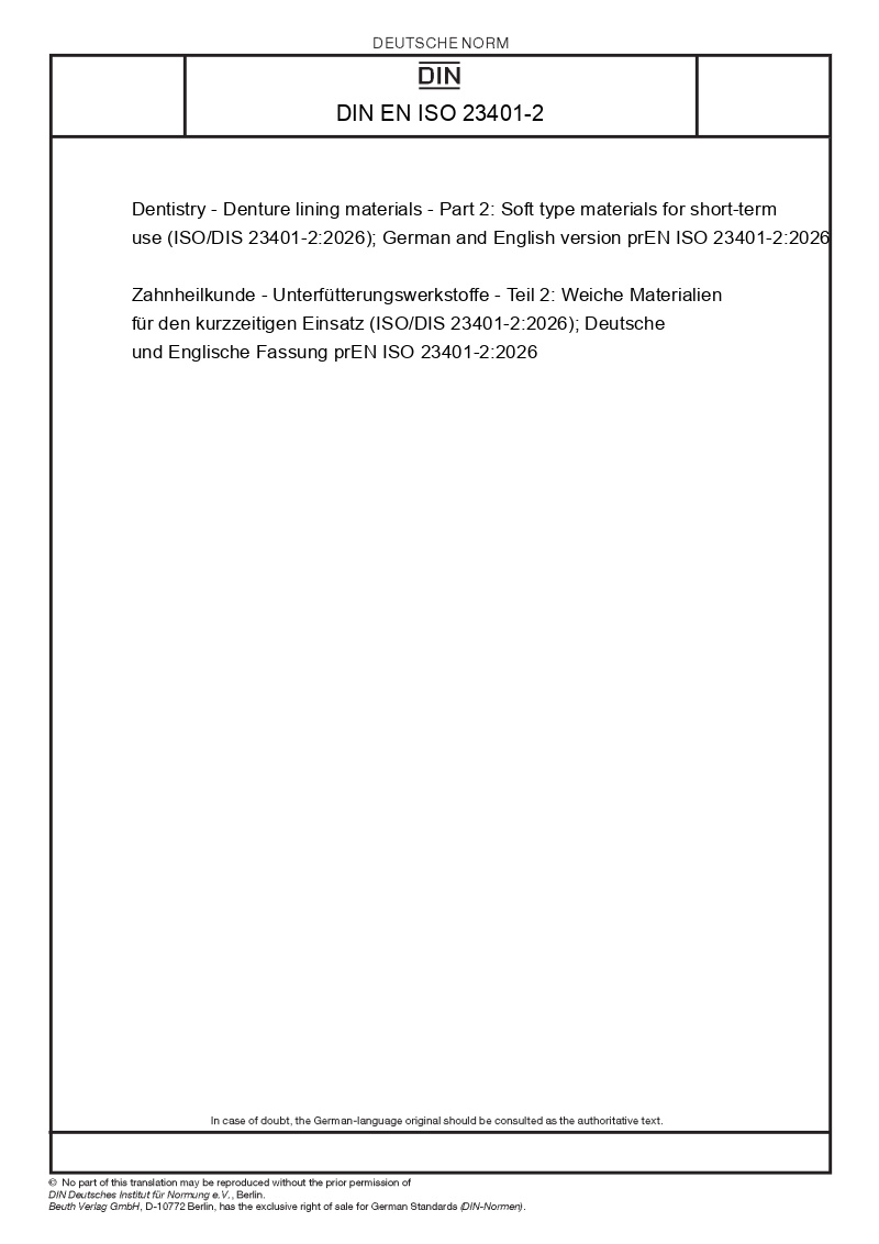 Dentistry - Denture lining materials - Part 2: Soft type materials for short-term use (ISO/DIS 23401-2:2026); German and English version prEN ISO 23401-2:2026