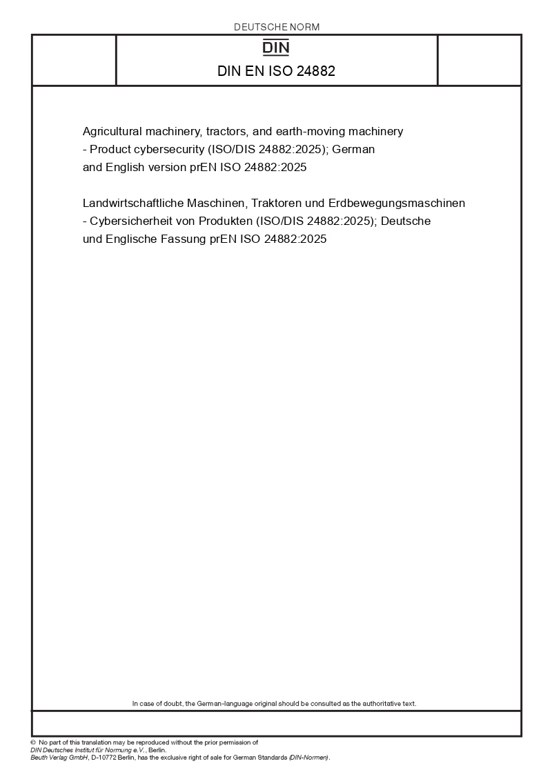 | Název produktu: | Agricultural machinery, tractors, and earth-moving machinery - Product cybersecurity (ISO/DIS 24882:2025); German and English version prEN ISO 24882:2025 |