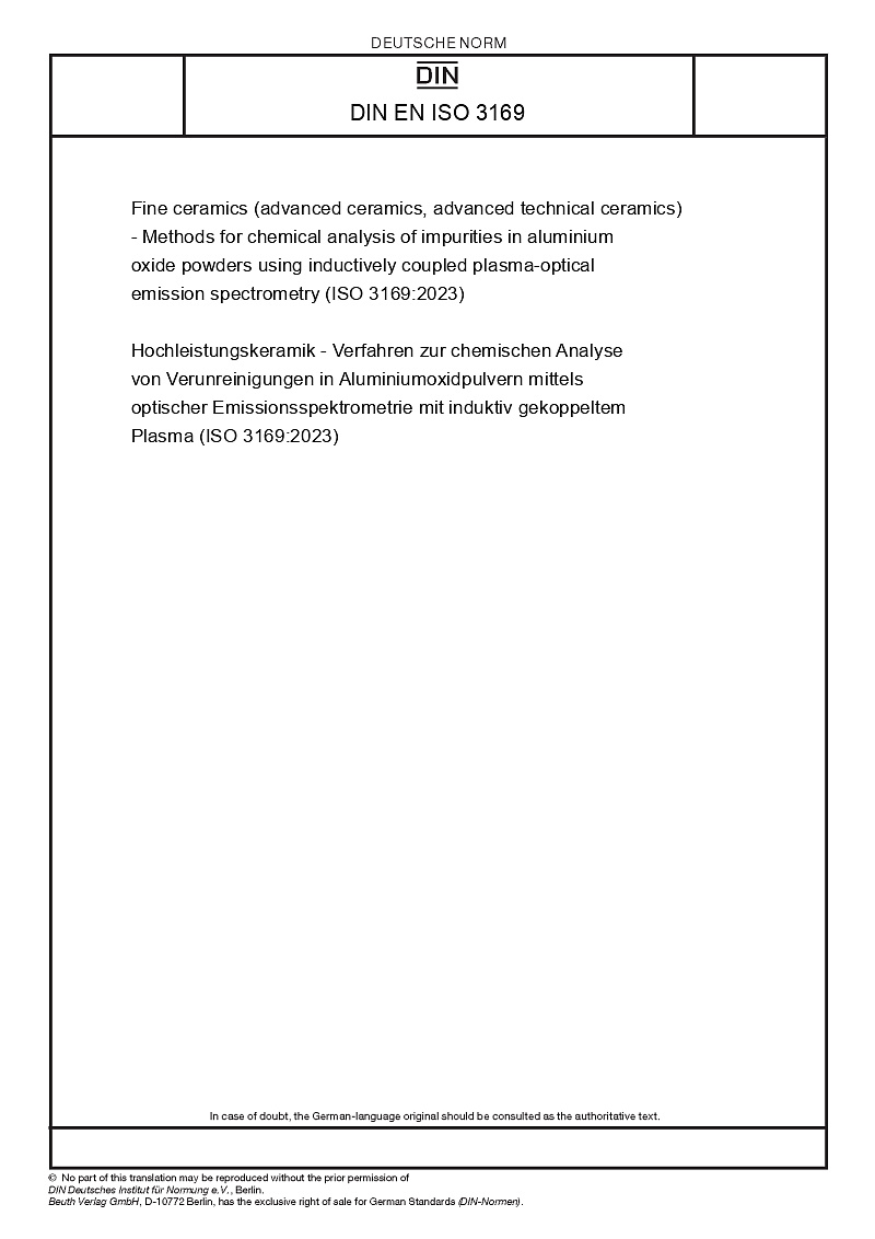 Hochleistungskeramik - Verfahren zur chemischen Analyse von Verunreinigungen in Aluminiumoxidpulvern mittels optischer Emissionsspektrometrie mit induktiv gekoppeltem Plasma (ISO 3169:2023)