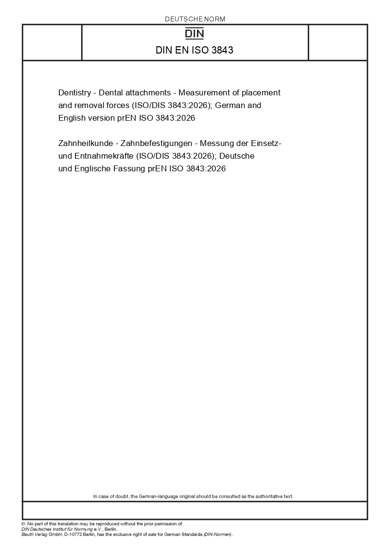 Zahnheilkunde - Zahnbefestigungen - Messung der Einsetz- und Entnahmekräfte (ISO/DIS 3843:2026); Deutsche und Englische Fassung prEN ISO 3843:2026