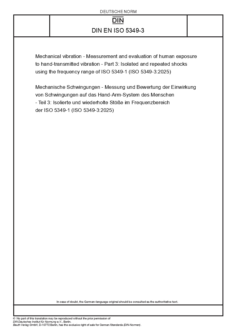 Mechanische Schwingungen - Messung und Bewertung der Einwirkung von Schwingungen auf das Hand-Arm-System des Menschen - Teil 3: Isolierte und wiederholte Stöße im Frequenzbereich der ISO 5349-1 (ISO 5349-3:2025)