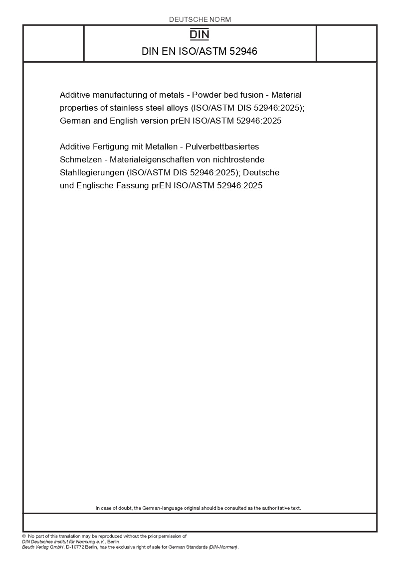 Název produktu: | Additive manufacturing of metals - Powder bed fusion - Material properties of stainless steel alloys (ISO/ASTM DIS 52946:2025); German and English version prEN ISO/ASTM 52946:2025 |