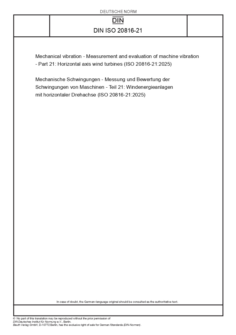 Mechanische Schwingungen - Messung und Bewertung der Schwingungen von Maschinen - Teil 21: Windenergieanlagen mit horizontaler Drehachse (ISO 20816-21:2025)