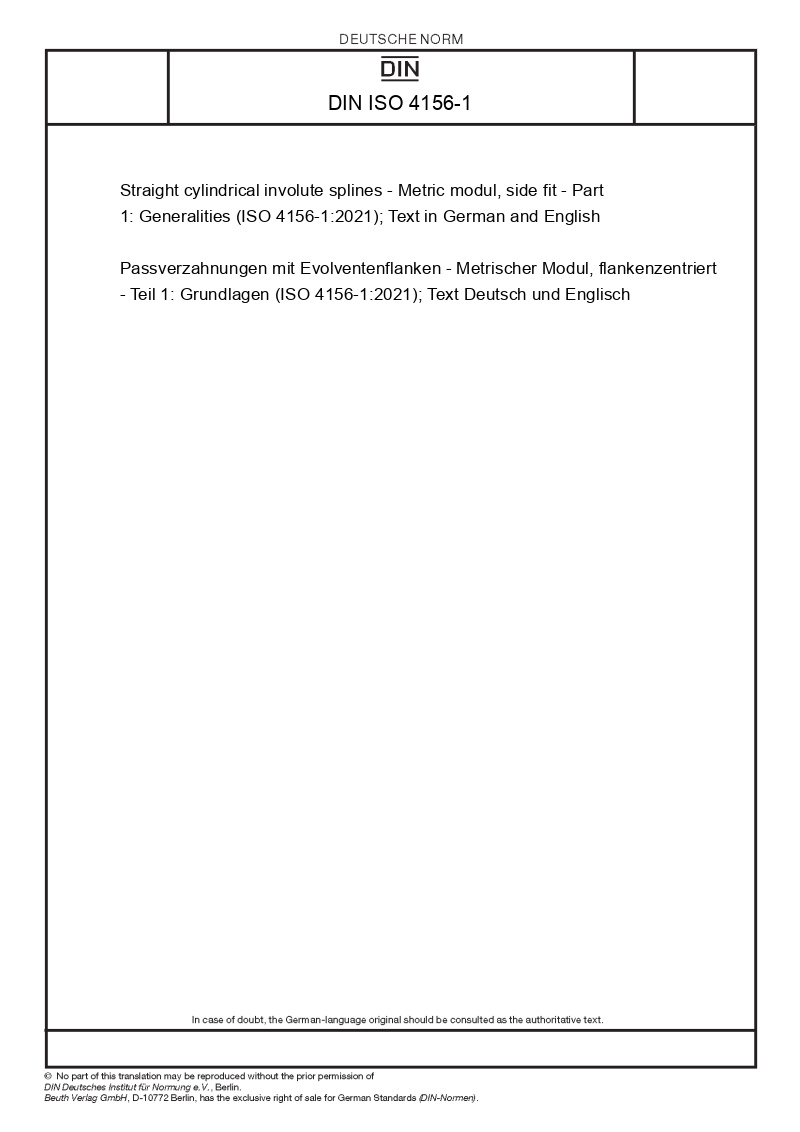 Název produktu: | Straight cylindrical involute splines - Metric modul, side fit - Part 1: Generalities (ISO 4156-1:2021); Text in German and English |