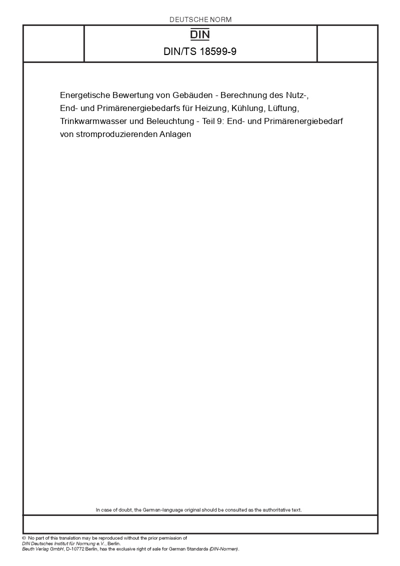 | Název produktu: | Energetische Bewertung von Gebäuden - Berechnung des Nutz-, End- und Primärenergiebedarfs für Heizung, Kühlung, Lüftung, Trinkwarmwasser und Beleuchtung - Teil 9: End- und Primärenergiebedarf von stromproduzierenden Anlagen |
