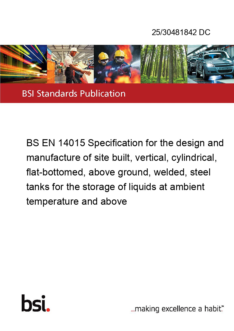 >25/30481842 DC BS EN 14015 Specification for the design and manufacture of site built, vertical, cylindrical, flat-bottomed, above ground, welded, steel tanks for the storage of liquids at ambient temperature and above