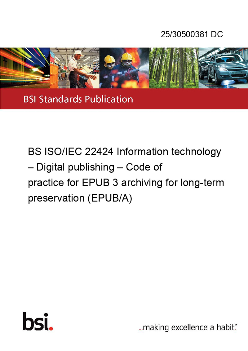 BS ISO/IEC 22424 Information technology – Digital publishing – Code of practice for EPUB 3 archiving for long-term preservation (EPUB/A)